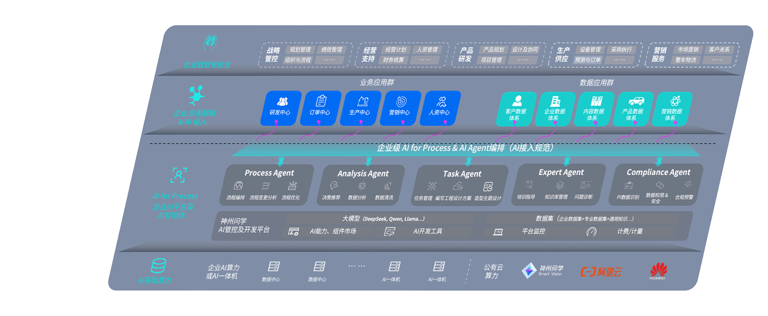 端到端的一站式AI工作空间深度融合了从企业战略规划到日常经营的全流程业务板块,,,定向解决车企内部领域多、、部门多、、、、链条长、、场景碎片化等难题,,支持车企快速构建以AI为核心的生产力写作体系,,实现任务执行与AI能力的无缝集成与交互